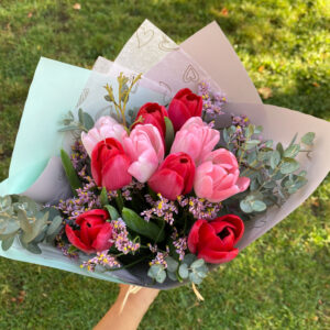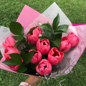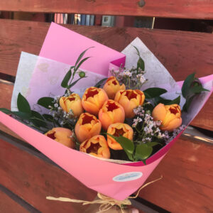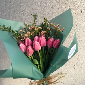 Bouquet formado por 10 unidades de tulipanes más follaje decorativo. La elección del color es según la disponibilidad del día.